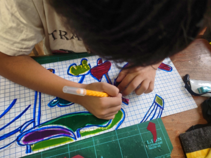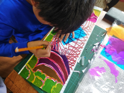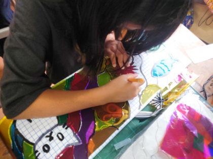 図工科の時間は、カッターナイフを使って工作用紙やセロハンを切り抜き、ステンドグラスのような作品を作ります。