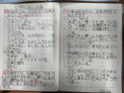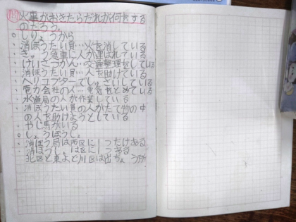 今日は、火災が起こったとき、だれがどんなことをするのか、教科書の絵を見ながら気付いたことを出し合い、消防署でどんなことを見学すればよいのか話し合いました。