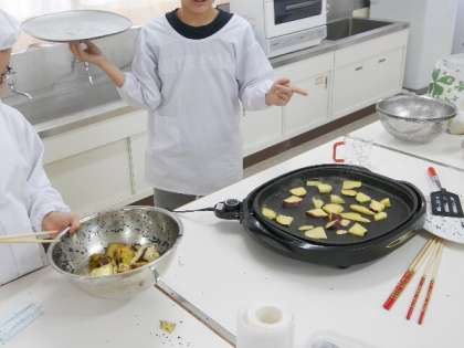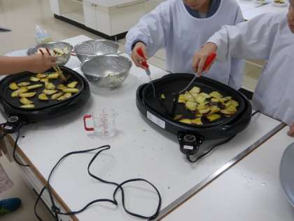 あゆみの学級園でとれたサツマイモを調理しています。とてもあまくておいしかったです。ごちそうさまでした。