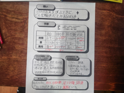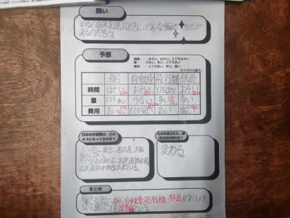 授業の終わりには、先ほど調べた「輸送手段の特徴」や「交通網」をもとにして、「原油」「ゲーム機」「新鮮な野菜」「衣類」「本や雑誌」などのそれぞれの製品について、大阪から東京まで輸送するときには、どんな輸送方法が適しているかをグループで考えました。