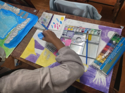 今日は、「あったらいいと思う学校」をテーマに、「空想の学校」を考えて画用紙いっぱいに描いています。