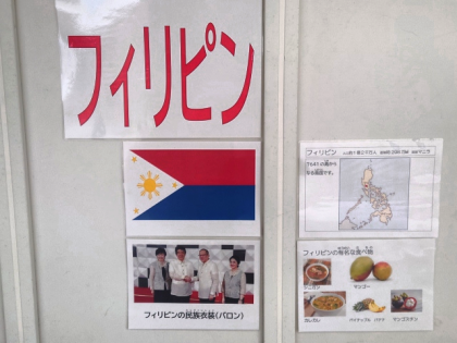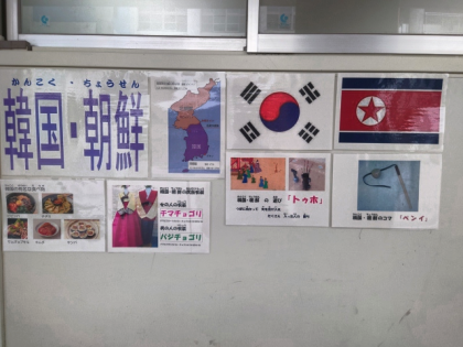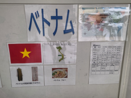 子どもたちに外国のことを知ってもらうために、11月から、校舎1階の廊下に、韓国・朝鮮、フィリピン、ベトナムを紹介する資料を掲示しています。