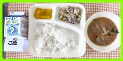 今日の献立は、豚肉と野菜のいためもの・いわしのつみれ汁・ かぼちゃういろう・ごはん・牛乳でした。