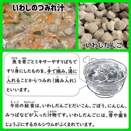 「いわしのつみれ汁」は、ゆでた後しょうが汁、料理酒で下味をつけたいわしだんごと、だいこん、ごぼう、にんじん、青みにみつばを使用しています。