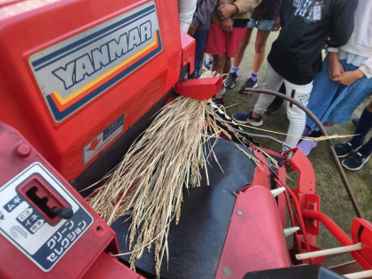 交代で稲を機械に入れ、脱穀作業を体験しました。