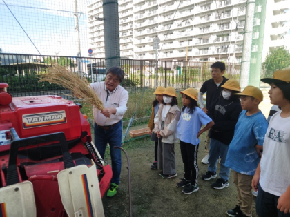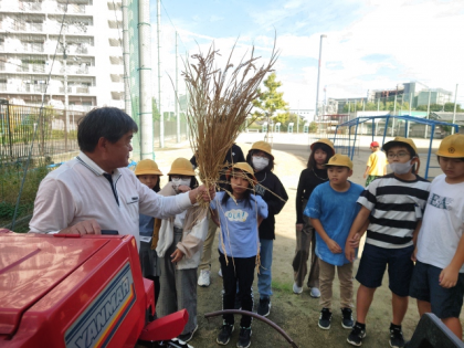 初めて見るコンバインに、子どもたちは興味津々。