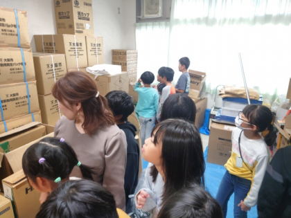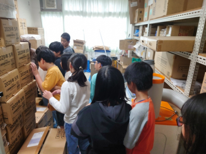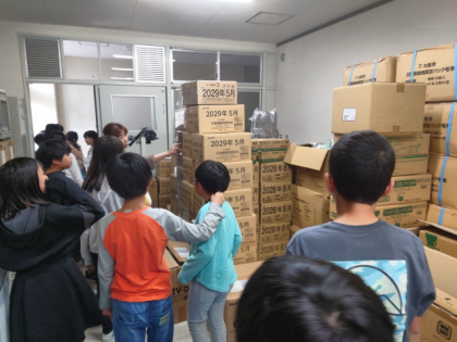 今日は、学校の備蓄倉庫にどんなものが置かれているのか、みんなで実際に見に行きました。