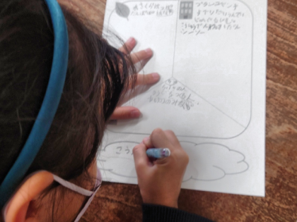 今日は、公園にはどんなものがあるのか、みんなで出し合い、「こと」「もの」「人」に整理しました。