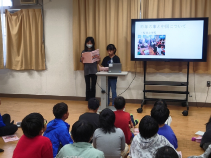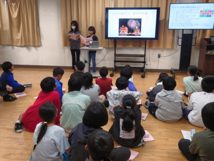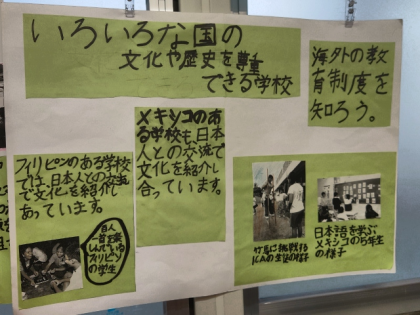 「いろいろな国の文化や歴史を尊重できる学校」グループの発表のようすです。