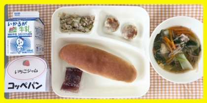 今日の献立は、焼きシューマイ・中華みそスープ・ツナと野菜のオイスターソースいため・コッペパン・いちごジャム・牛乳でした。