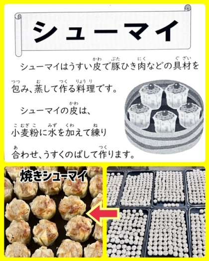「焼きシューマイ」は、冷凍の肉シューマイをホテルパンにならべて、焼き物機で焼いています。1人2コずつです。