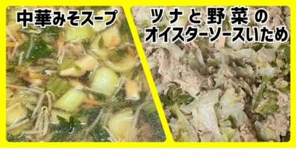 「ツナと野菜のオイスターソースいため」は、ツナ、キャベツ、ピーマンを綿実油でいため、塩、こしょう、オイスターソースで味つけしています。