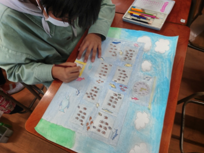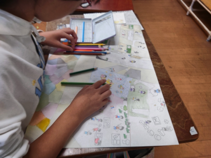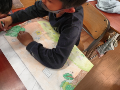 図工科の時間は、「あったらいいと思う学校」をテーマに、「空想の学校」を考えて画用紙いっぱいに描いています。