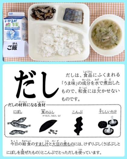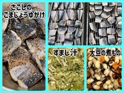 今日の献立は、さごしのごまじょうゆかけ・すまし汁・大豆の煮もの・ごはん・牛乳でした。