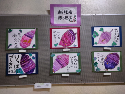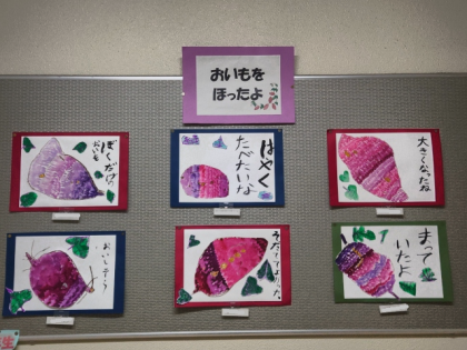 2年生の子どもたちは、10月においもほりを体験しましたが、おいしそうなさつまいもを一人一人絵に表現し、おいもほりをしたときの気持ちを言葉に表しました。