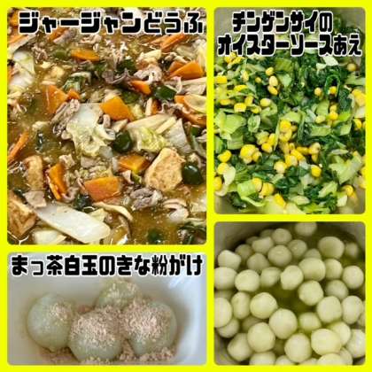 今日の献立は、ジャージャンどうふ・チンゲンサイのオイスターソースあえ・まっ茶白玉のきな粉がけ・ごはん・牛乳でした。