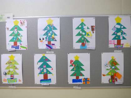 1年生がクリスマスツリーをきれいに作りました。1年の掲示板に掲示されました。もうすぐクリスマスですね。