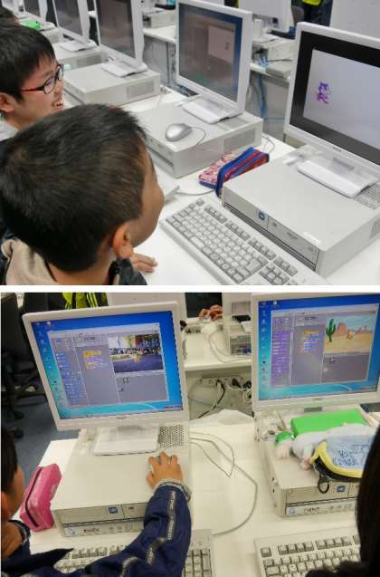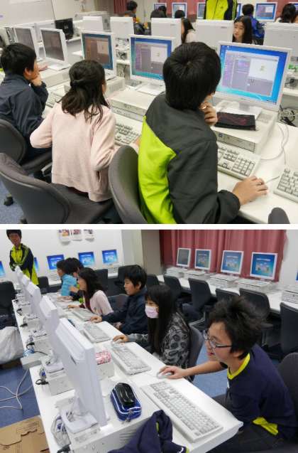子どもたちは、いろんな音をならしたり、キャラクタを歩かせたりするプログラムを作って、プログラミングを体験しました。