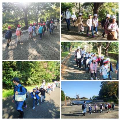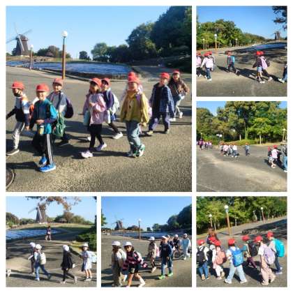 学年ごとにオリエンテーリングのスタート地点の大芝生に向かっています。