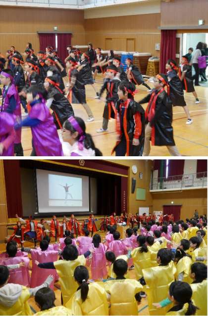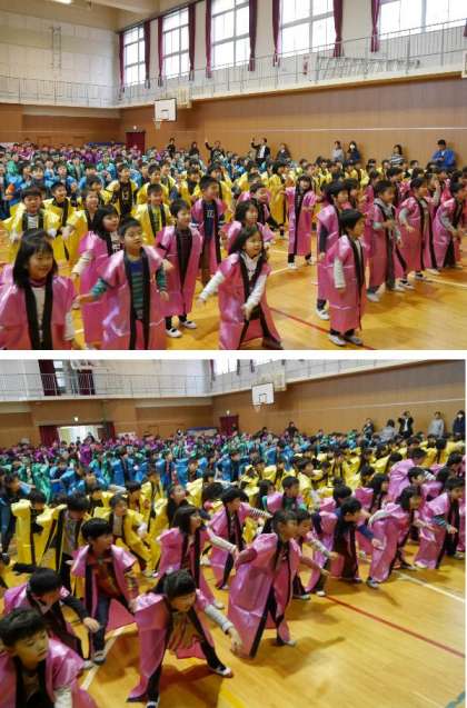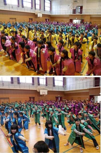 全校朝会では、学校で購入したよさこいソーランのはっぴを全校児童が着て、ソーランの練習をしました。1年が桃色、2年が黄色、3年が青色、4年が緑色、5年が紫色、6年が黒色で、ソーラン隊が赤色です。体育館の中がカラフルになりました。