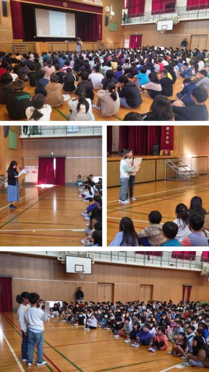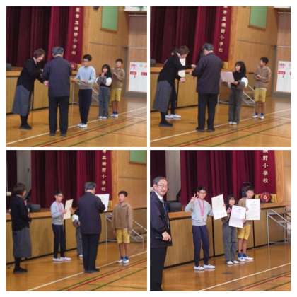 初めに、大阪市の陸上競技の大会に参加し入賞した児童に、表彰状とメダルを全校のみんなの前で渡しました。