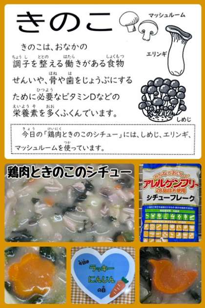 「鶏肉ときのこのシチュー」は、鶏肉とベーコンを主材に、しめじ、エリンギ、マッシュルーム、じゃがいも、たまねぎ、にんじん、青みに冷凍のほうれんそうを使用しています。アレルギー対応用のシチュールウの素を使用しています。