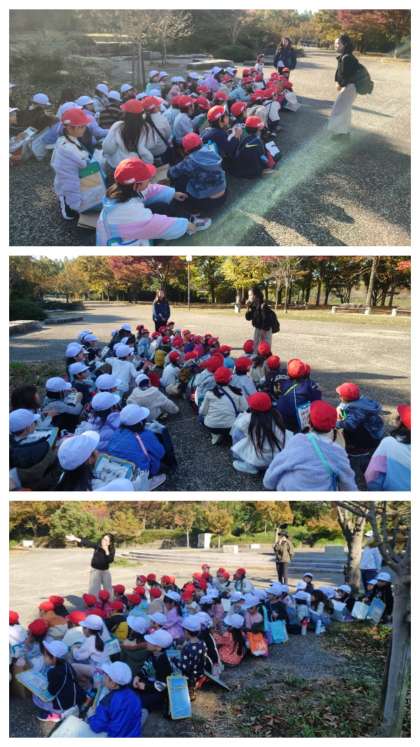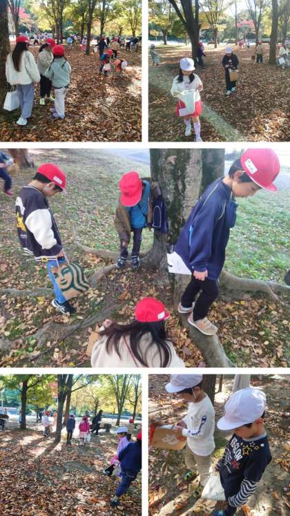 公園の緑の中で、クヌギ、シラカシ、マテバシイ、スダジイなどのどんぐりや、いろいろな色・形の葉っぱをたくさん集めました。