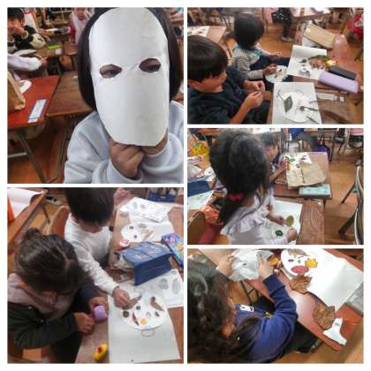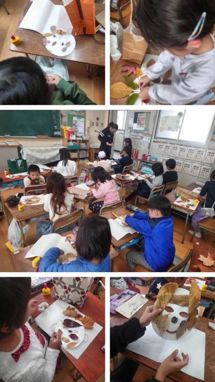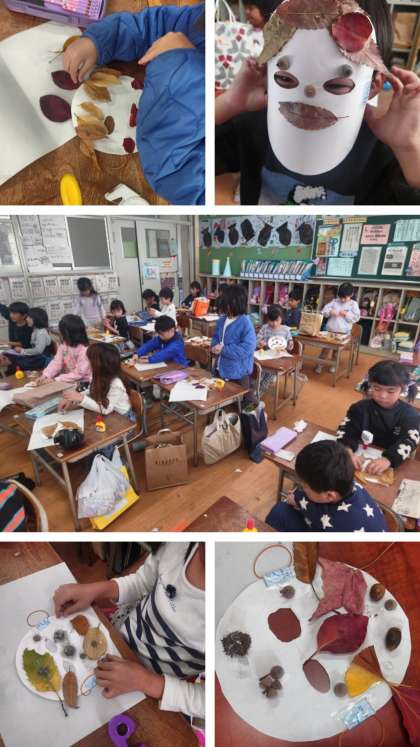鶴見緑地での「秋みつけ」のあと、教室で「葉っぱのお面」を作りました。