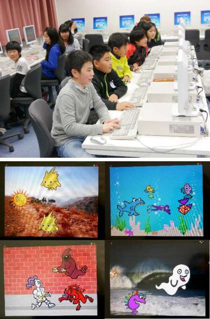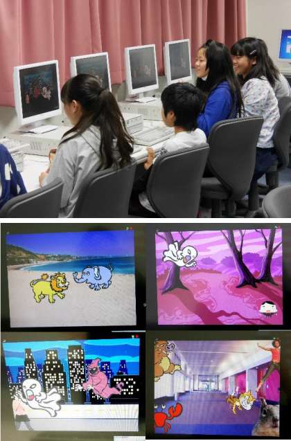 校長先生のプログラミング講座の3回目の授業です。今日は、さらに新しい命令や考えをしって、最終的に作品を作って皆で発表しました。いろいろな作品ができあがりましたね。子どもたちは自分のパソコン画面を全員に転送して発表しました。とても楽しそうでした。