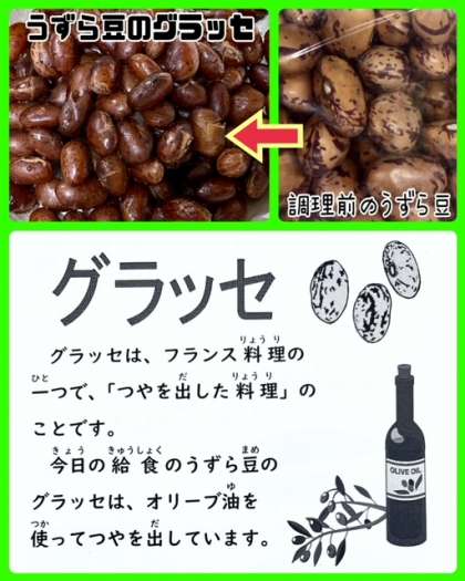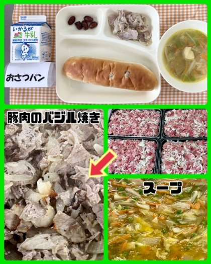 今日の献立は、豚肉のバジル焼き・スープ・うずら豆のグラッセ・おさつパン・牛乳でした。