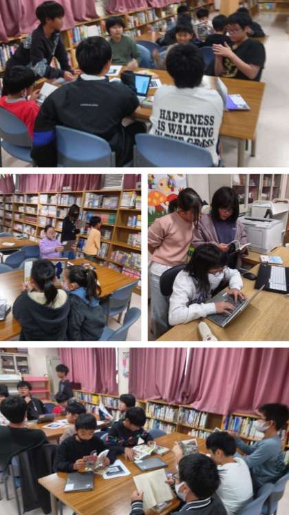 図書の時間は、図書室で自分が関心のある本を読んでいます。