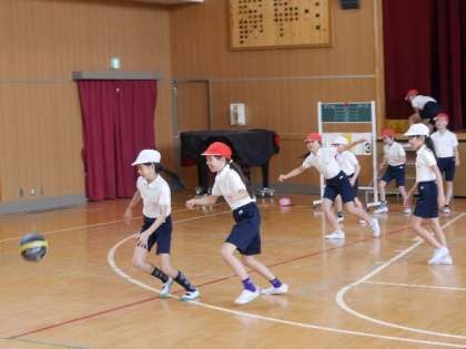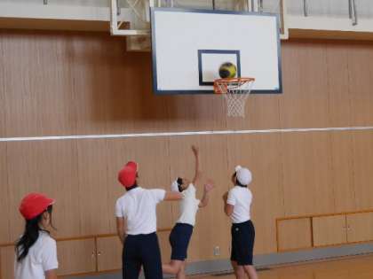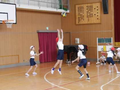 5年生が体育館でバスケットボールの授業をしていました。ゲームをしながらとても楽しんでいました。
