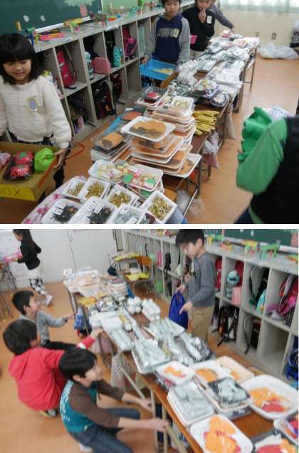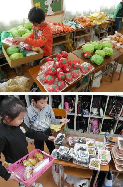 3年生が手作りの品をならべて。教室でスーパーの買い物を体験学習していました。いろいろな家庭を想定して買い物をしていきます。おもしろそうですね。