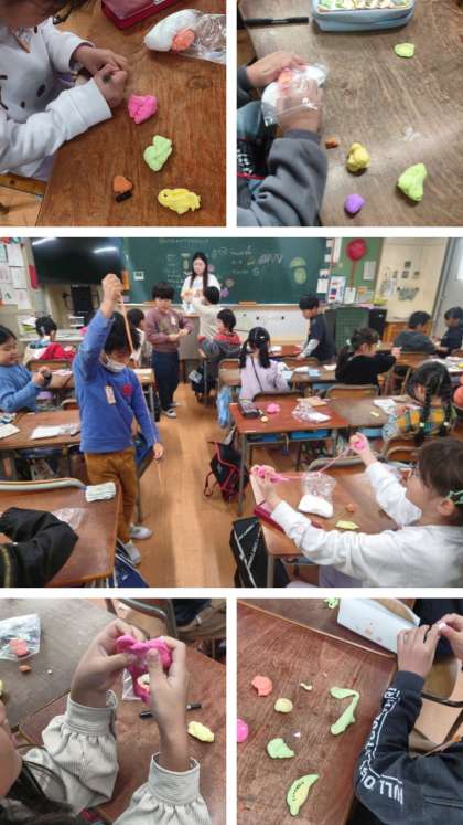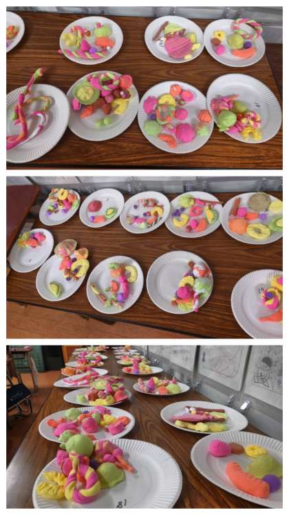 図工科の時間は、紙ねんどを絵の具で着色して、フルーツパフェを作っています。