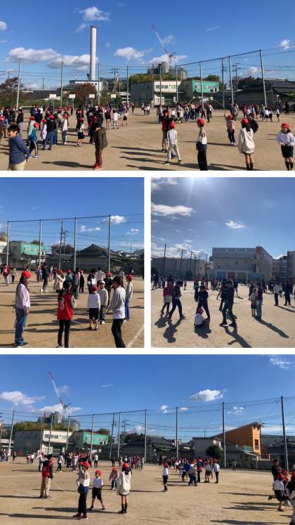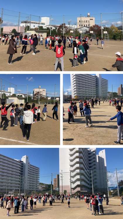 20分休みに、ドレミ班(たてわり班)のメンバーで大なわとびをしています。
