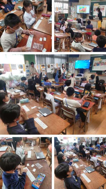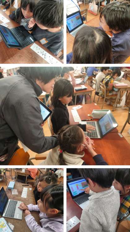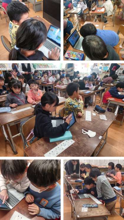 リズムカードで作ったリズムを、パソコンのプログラミングアプリ「Scratch」に入力し、自分が作ったリズムを確認したり、ペアで紹介し合ったりしました。