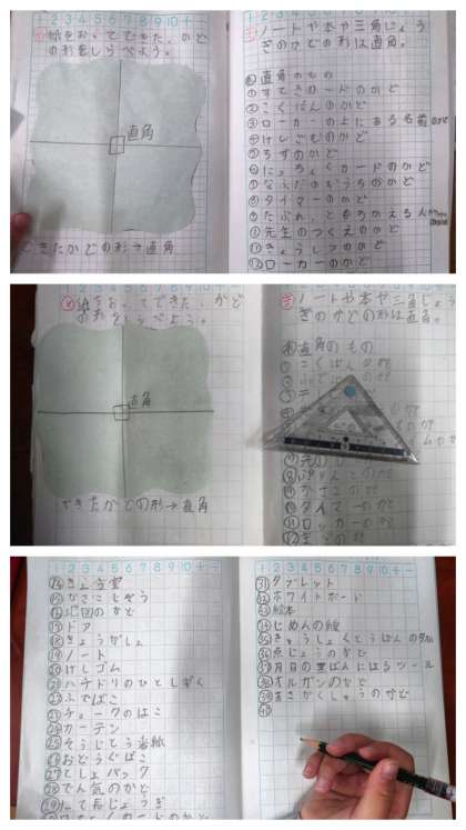 「黒板の角」「教科書の角」など、たくさんの「直角」が見つかりましたね。