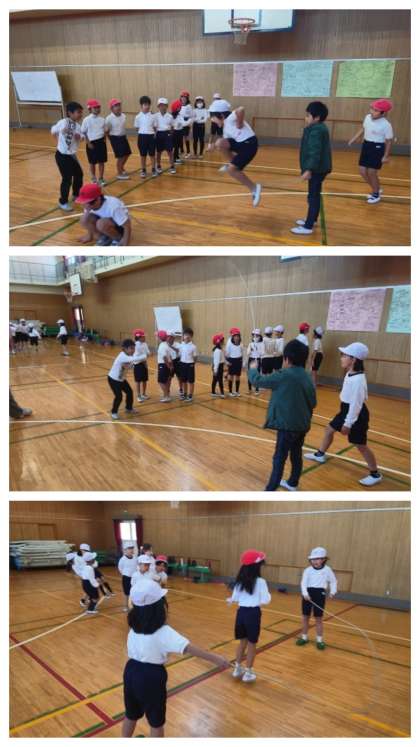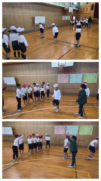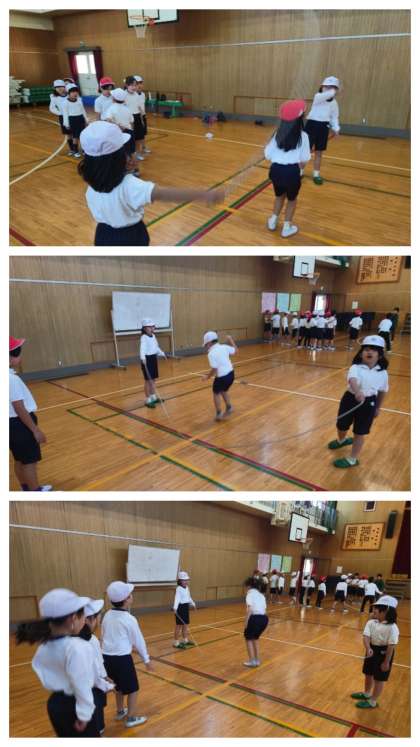 体育科の時間は、体育館で大なわとびの練習をしました。