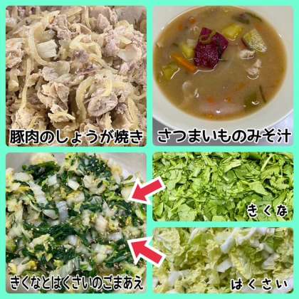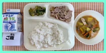 今日の献立は、豚肉のしょうが焼き・さつまいものみそ汁・きくなとはくさいのごまあえ・ごはん・牛乳でした。、