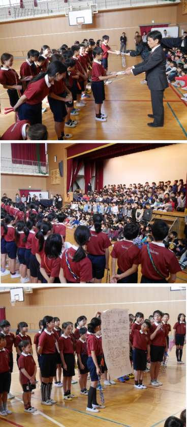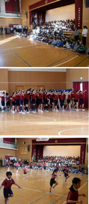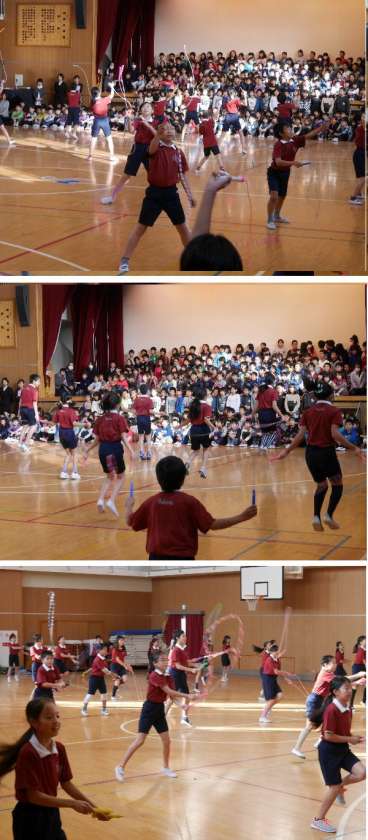 終業式のあとに、おおさかジャンプアップ大会で優勝した焼野やっきーず!!!!!!が全校児童にその演技を披露してくれました。演技終了後に、キャプテンから友だちや先生方のみんなの支えで優勝できたことを感謝の言葉であいさつしてくれました。また、直接指導いただいた先生に色紙を手渡しました。最後には、3学期から休み時間になわとびをしたい人は教えるので一緒になわとびをしようと呼びかけてくれました。