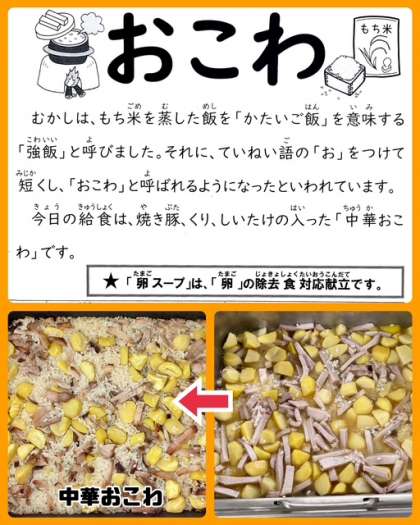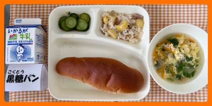 今日の献立は、中華おこわ・卵スープ(卵除去食対応献立)・きゅうりのピリ辛あえ・黒糖パン・牛乳でした。