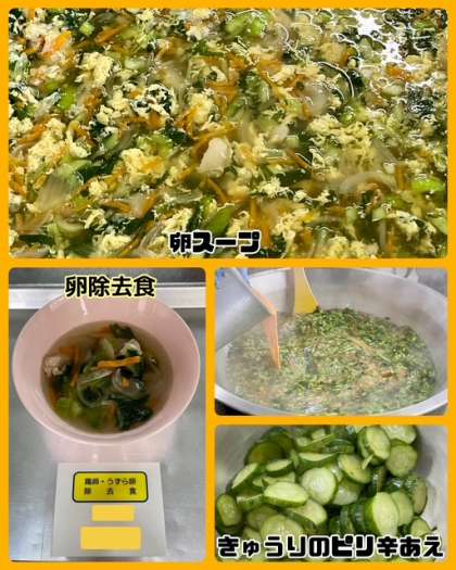 「卵スープ」は、鶏肉、たまねぎ、チンゲンサイ、にんじんを煮て、味つけしています。この献立は、【卵】の除去食に対応しています。液卵を流し入れる前の段階で除去食を採取し、最後に液卵を流し入れます。誤配のないようピンク色の食器に配食し、個票をつけて提供します。