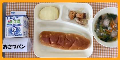 今日の献立は、さけのマリネ・肉だんごと麦のスープ・りんご・おさつパン・牛乳でした。