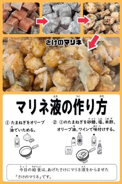 「さけのマリネ」は、塩、こしょう(白)で下味をつけ、でん粉をまぶしてなたね油であげたさけ(角)に、たまねぎの入ったマリネ液をからませています。