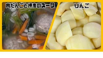 「肉だんごと押麦のスープ」は、肉だんごと食物繊維の多い押麦のほか、旬のだいこん、にんじん、青みに冷凍のほうれんそうを使用します。