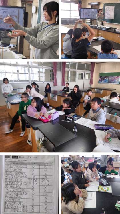 回路の一部にいろいろなものを入れて、豆電球の明かりがつくかどうかを調べました。