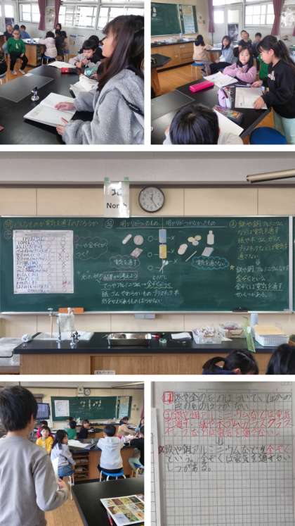 鉄や銅、アルミニウムなどは電気を通しましたが、紙や木、ゴム、ガラスなどは電気を通しませんでした。