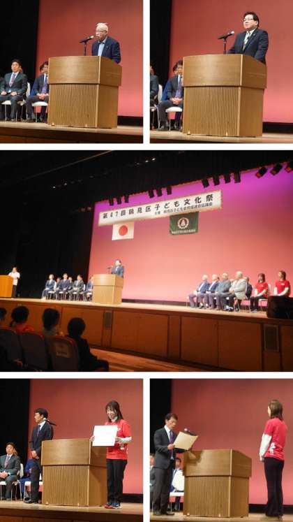 開会式では、久野会長、内田区長、中田地域活動協議会会長のごあいさつに続き、焼野地域のお2人の保護者の方が、区子連から「功労賞」を受賞されました。