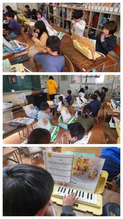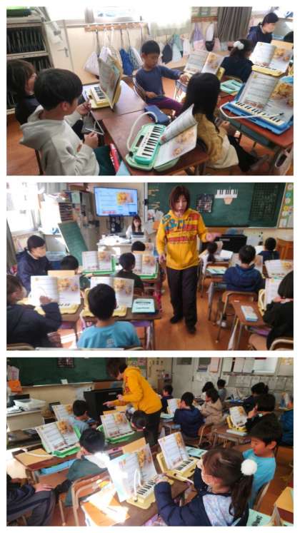 音楽科の時間は、教科書の「こぎつね」の曲を、鍵盤ハーモニカのメロディに合わせてトライアングルや鈴などのタンブリン、ウッドブロック、カスタネットなどの打楽器を使って演奏しました。