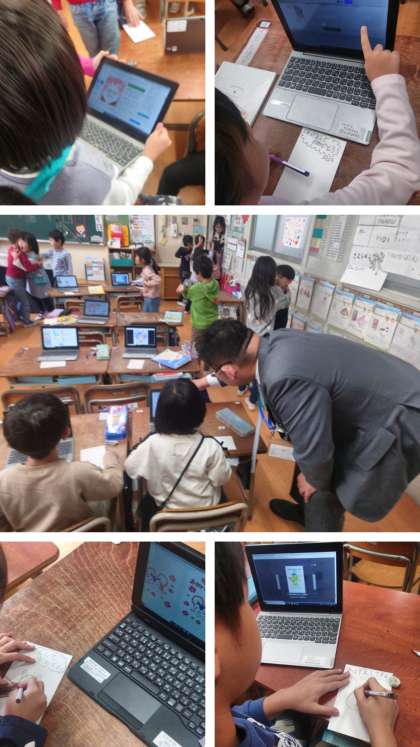 パソコンを使って、はがきの裏に描くへびなどのイラストを調べています。